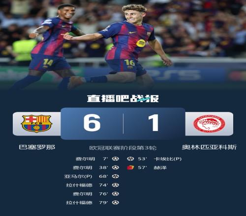 欧冠第3轮第一比赛日9场比赛全部结束,这9场比赛一共轰进43球(场均4.8球),其中有三支球队单场轰出6+进球(巴萨6-1奥林匹亚科斯、巴黎7-2勒沃库森、埃因霍温6-2那不勒斯)。