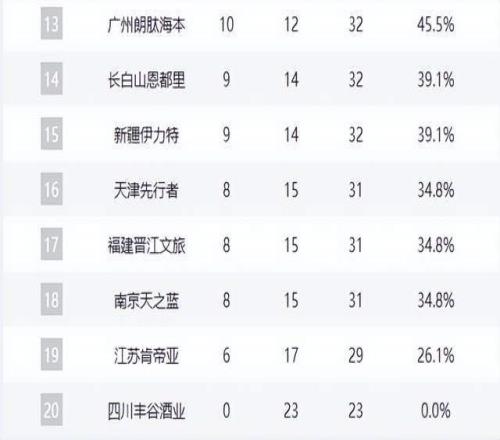 底部阵营惨烈厮杀:天津、福建、同曦三队同为8胜15负,江苏(7胜16负)与四川(6胜17负)则深陷泥潭,保级压力山大。