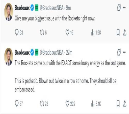 这场比赛让火箭记者Bradeaux非常不满,他在赛后写道:请火箭球迷们评论一下这场比赛你们最不满的地方?(评论区很多人在炮轰申京、阿门,也有人指责乌度卡,更多的是对积极性、防守不满)