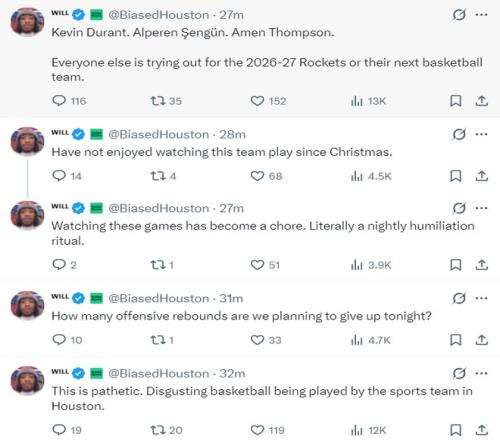 休媒Will:火箭队这是在备战26-27赛季了吗?我很难想象观看火箭的比赛是一件令人厌烦的事,每一个夜晚感觉都是在被屈辱困扰。我们一场比赛要丢多少个后场篮板?这两场失利太可悲了,火箭队目前所打的篮球简直令人作呕。