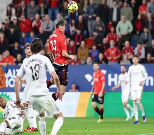 皇马在开局拥有控球的优势,但奥萨苏纳利用犀利的反击造威胁,第27分钟布季米尔的抢点攻门击中了立柱,让皇马球迷惊出一身冷汗。10分钟后库尔图瓦出击踩到了布季米尔的脚犯规送点,后者点射首开纪录,上半场1球领先。下半场回来,皇马也通过换人调整,迪亚斯、阿诺德等球员替补登场,第73分钟,巴尔韦德连过数人送出助攻,维尼修斯抢点建功,皇马扳平了比分。