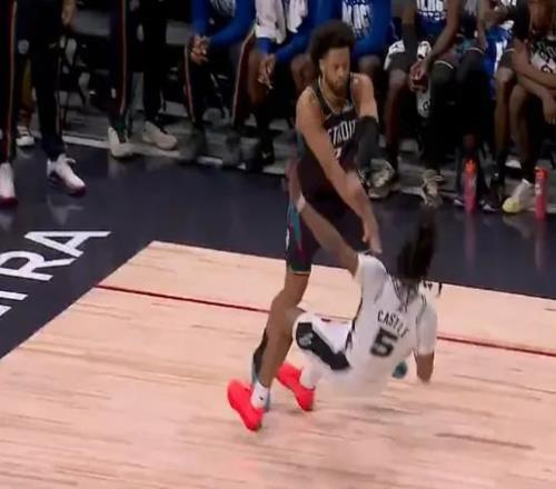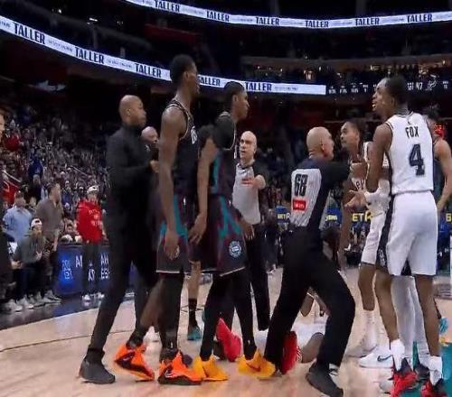 卡斯尔还没来得及反应,马刺队的凯尔登-约翰逊就上前为他出头,推搡了康宁汉姆。于是,活塞队的球员围了上来,全明星中锋杜伦用手指着凯尔登-约翰逊,嘴里念念有词,于是裁判赶紧将两队的球员分开制止冲突。