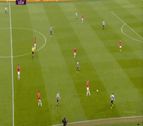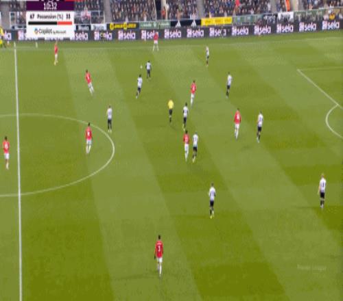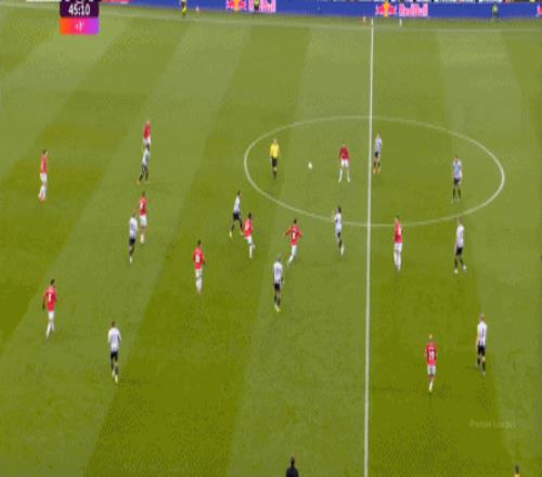 所以,当你的进攻端并不能自主成型,也无法等待对手强度大幅回落的情况下,曼联在上半场的进攻就显得有一搭没一搭了,比如球队的第一次进攻,来自前场抢断后打飞的远射: