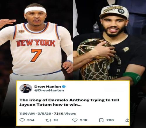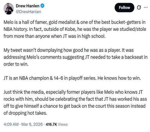 Hanlen随即正面回应,先是夸了一通安东尼的名人堂身份,然后话锋一转:“我的推文并不是贬低他,而是回应他关于塔图姆需要退居二线才能赢球的言论。塔图姆是NBA总冠军,季后赛系列赛战绩14胜6负,他知道如何赢球。”