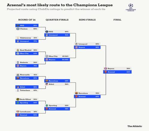 阿森纳作为夺冠热门,很大程度上得益于他们作为本届欧冠评分最高球队的地位,但淘汰赛的签位同样对他们有利。基于所有可能的情景和对手的ClubElo评分,阿森纳赢得欧冠的概率为32%,拜仁则以12%位居次席。如果两队在抽签中互换位置,阿森纳的夺冠概率将降至26%,而拜仁的概率将升至17%左右