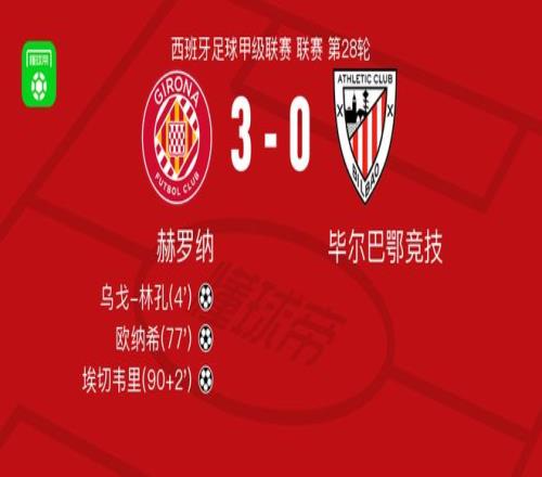 北京时间3月14日西班牙足球甲级联赛 联赛 第28轮,赫罗纳主场对阵毕尔巴鄂竞技。赫罗纳乌戈-林孔破门,欧纳希破门,埃切韦里破门。最终比分赫罗纳 3-0 毕尔巴鄂竞技。