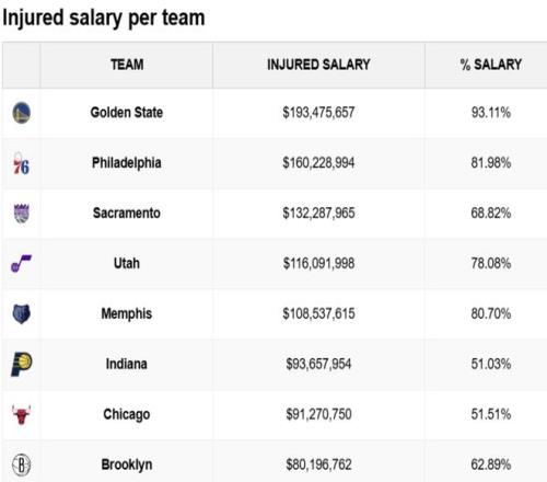金州勇士:伤病薪资 $193475657,占总薪资比例 93.11%