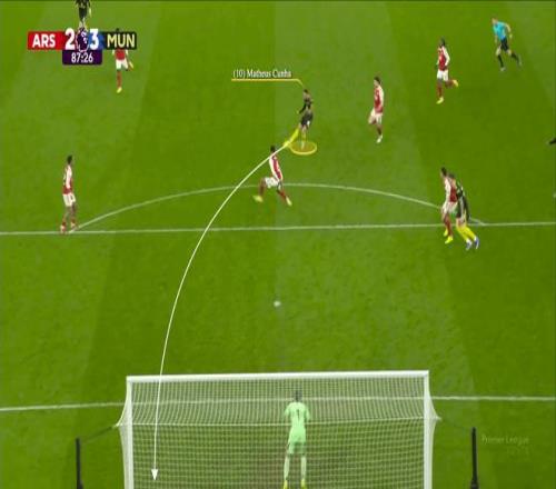 布鲁诺-费尔南德斯控制住球后,库尼亚冲向场内,插入阿森纳中场与防线之间的空当。本-怀特最初在盯防库尼亚,但费尔南德斯将球传给梅努后的跑动,让阿森纳右后卫陷入了1对2的局面。