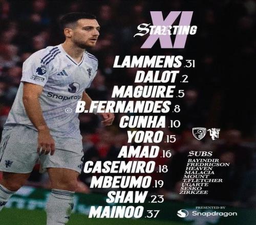 曼联首发:31-拉门斯、2-达洛特、15-约罗、5-马奎尔、23-卢克-肖、37-梅努、8-B费、18-卡塞米罗、16-迪亚洛、10-库尼亚、19-姆伯莫