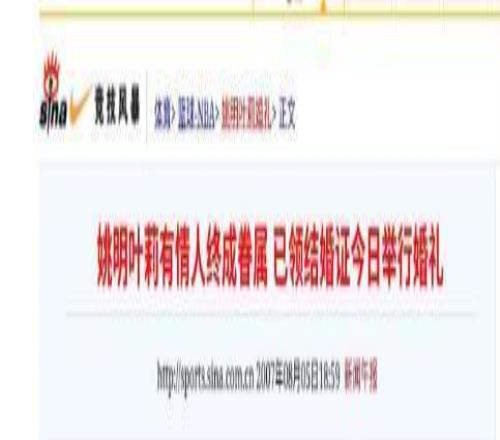 参考资料:《新闻午报》2007年8月7日刊发报道《姚明叶莉有情人终成眷属 已领结婚证今日举行婚礼》