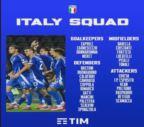 意大利公布了世界杯预选赛附加赛大名单,卡拉菲奥里入选。