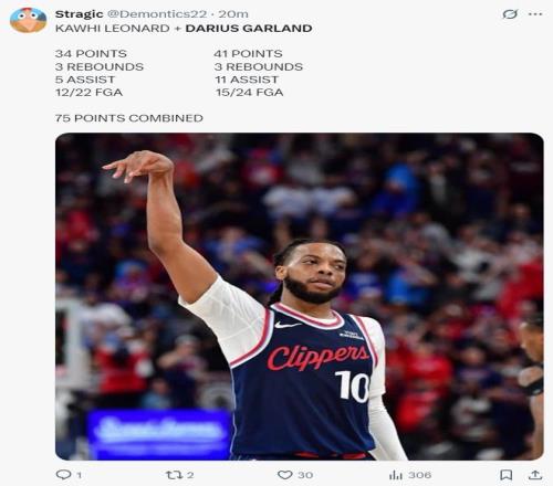 此役伦纳德/加兰两个核心都有不俗的发挥,伦纳德拿到34分5助攻,加兰拿到41分11助攻,伦纳德在加时赛拿到7分,加兰在加时赛+末节合计拿到12分,双核驱动的比赛是快船球迷最乐意看到的。