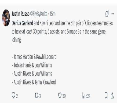 7.小卡/加兰同场拿到30+5助攻+5三分成为队史第五对组合:哈登/小卡、托哈/路威、小里弗斯/路威、小里弗斯/克劳福德、小卡/加兰;