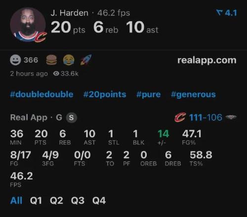 对了,哈登在带领骑士客场111-106战胜鹈鹕比赛中,可是以0罚球得到的20分外加10助,正负值+14冠绝全场,人家再次证明了只靠运动战得分照样能够收割比赛。