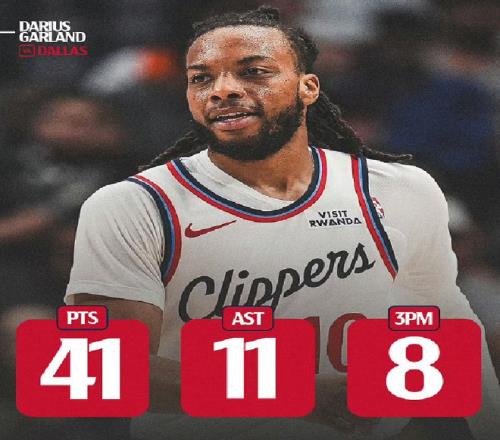 加兰以首发控卫身份出战约39分钟,投篮24中15,其中三分12中8,罚球3中3狂轰41分外加11助大号两双数据,带领快船客场138-131击败独行侠。