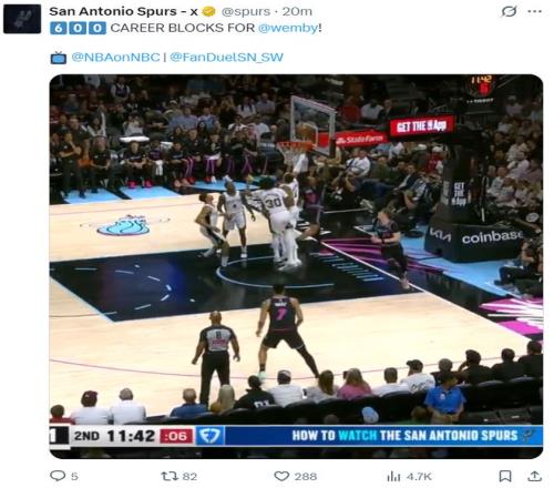 1.文班亚马生涯送出600+盖帽队史第五位;