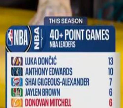 赛后根据统计,本场比赛的42分是米切尔本赛季第6次单场得分40+,同期这一数据排在联盟所有球员的第4位,与杰伦-布朗并列,仅次于东契奇(13次)、安东尼-爱德华兹(10次)以及亚历山大(7次)。
