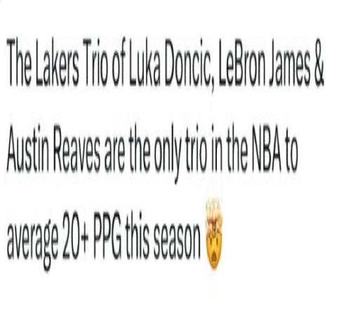 据外媒更新,湖人是本赛季NBA联盟唯一一支拥有三位球员场均得分20+的球队,稳稳的进攻三家猛车,完全的火力王级别。其中东契奇33.4分,同时他也是球员得分榜榜首,里夫斯23.5分、詹姆斯21分。