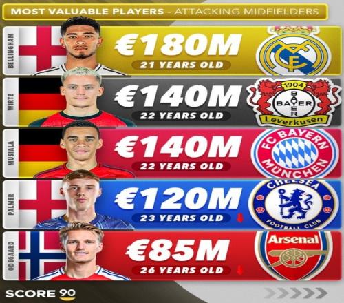 体育播报6月13日宣 2024-25赛季结束,Score 90更新了进攻型中场的身价排行,皇马前腰贝林厄姆1.8亿欧元第一,勒沃库森的维尔茨和拜仁的穆西亚拉都是1.4亿欧。