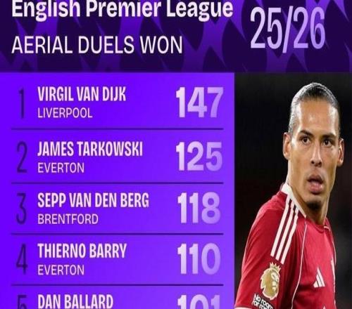 本赛季英超争顶成功榜:范戴克147次居首,塔科夫斯基次席