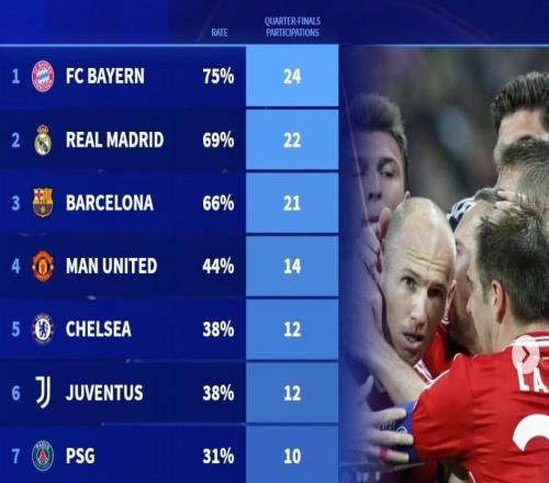 9495赛季至今欧冠8强晋级次数:拜仁24次第1,曼联第4